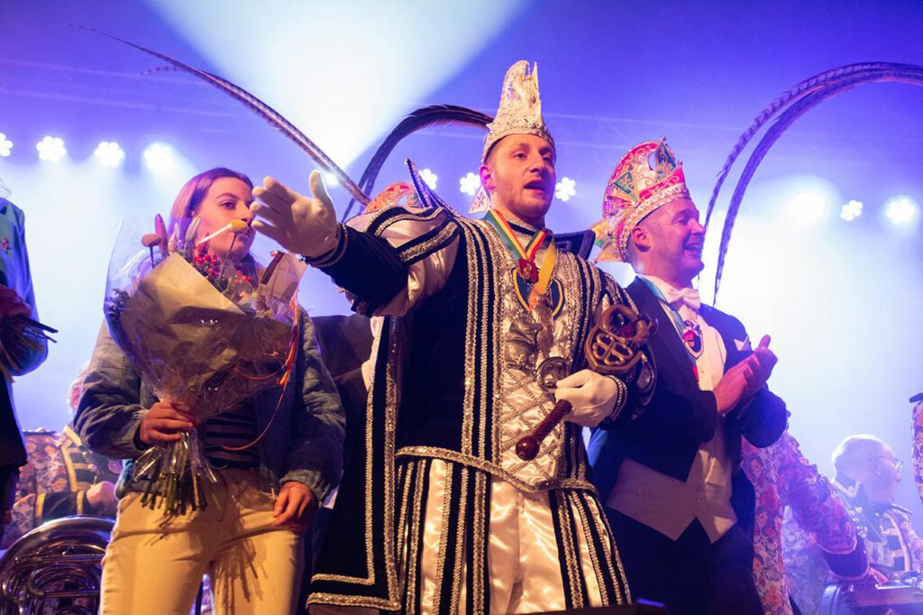 Nadat ruim een uur de lach door de zaal bulderde, werd het tijd voor de installatie van de nieuwe hoogheid, de 90ste stadsprins van Sittard: Ruud II. Toen hij in vol ornaat op de bühne stond, wist hij een indrukwekkende proclamatie – rechtstreeks vanuit het hart – te presenteren, met een lach en een traan.
